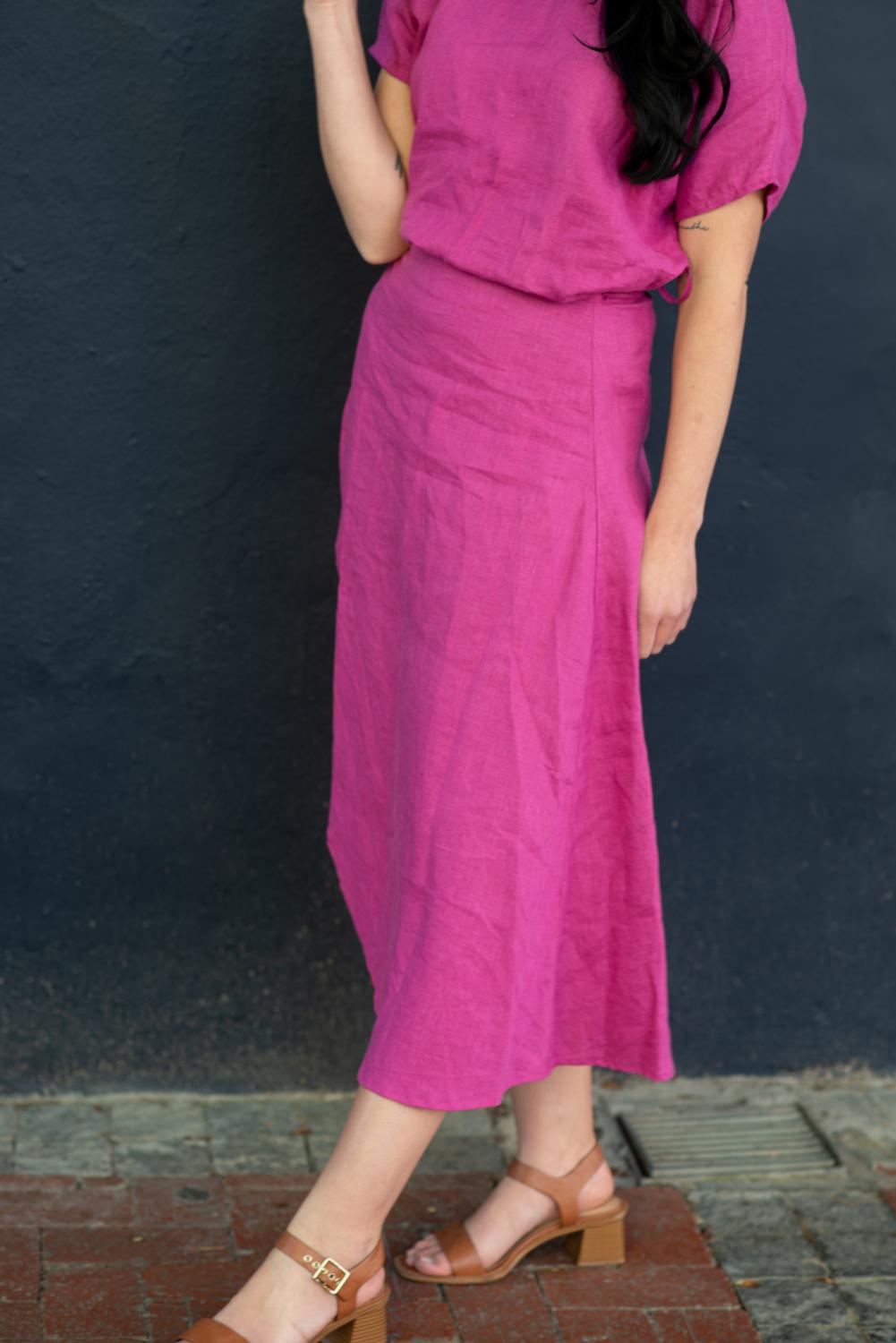 This elegant wrap skirt is crafted from 100% linen, offering comfort and effortless style. It's flattering A-line silhouette is enhanced by a side tie detail, allowing for an adjustable fit that moves with you. Falling to a versatile midi length, it transitions seamlessly from casual days to polished occasions.